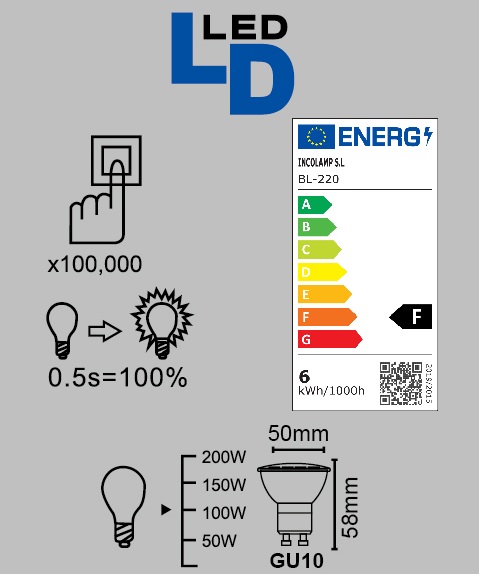Bombilla led rosca gu-10 para utilizar en empotrados o lámparas. Pensada para instalaciones domesticas, no industriales o comerciales. Trabaja a 220–240 V, vida útil 25.000 h, IP20 y no regulable.